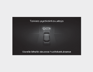Kun älykäs etäpysäköintiavustin ei toimi asianmukaisesti, tietoviihdejärjestelmän näyttöön ilmestyy varoitusviesti "Check Parking Assist" (Tarkista pysäköintiavustaja). Jos viesti tulee näkyviin, lopeta toiminnon käyttäminen. Suosittelemme että valtuutetun Kia-jälleenmyyjän/huoltokumppanin annetaan tarkastaa toiminto.