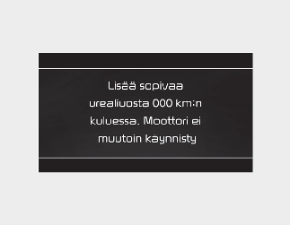 ”xxx km (mailia)” esittää jäljellä olevan sallitun matkaetäisyyden, joten älä jatka ajamista jäljellä olevan matkaetäisyyden rajoitukseen korjaamatta toimintahäiriötä. Muuten autoa ei voi käynnistää uudelleen, kun moottori on sammutettu käyttämällä MOOTTORIN KÄYNNISTYS/PYSÄYTYS -painiketta. Tässä tapauksessa, vie ajoneuvo tarkistettavaksi ammattikorjaamoon. Kia suosittelee yhteydenottoa valtuutettuun Kia-jälleenmyyjään/huoltokumppaniin.
