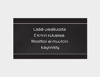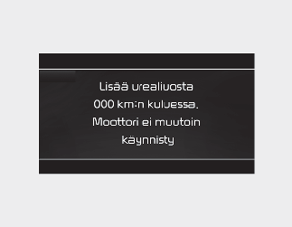 Kun varoitusjärjestelmä on saavutettu lopulliseen tilansa ja estänyt auton uudelleenkäynnistyksen, se deaktivoituu vain, jos urealiuossäiliö täytetään tai viat on korjattu. Jos autoa ei voida käynnistää uudelleen ilmoituksen ”Täytä ureasäiliö tai ajoneuvo ei käynnisty” takia, täytä urealiuosta riittävästi, odota muutama minuutti, ja yritä käynnistää auto uudelleen. Jos autoa ei voi käynnistää ureatasosta riippumatta, tarkastuta auto ammattikorjaamossa. Kia suosittelee yhteydenottoa valtuutettuun Kia-jälleenmyyjään/huoltokumppaniin.
