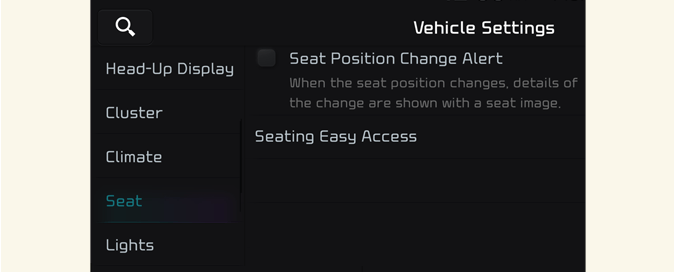 Select Setup → Vehicle → Seat from the Settings menu in the infotainment system screen, you may use various convenience functions.