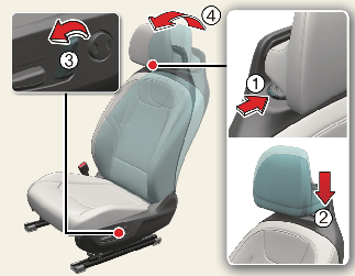 To lower the headrest, push and hold the release button (2) on the headrest support.