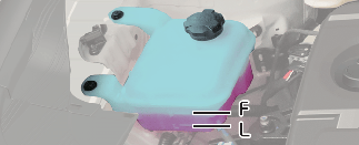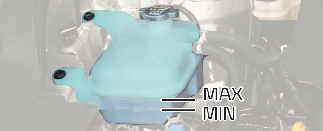 The coolant level should be filled between MAX and MIN (F and L) marks on the side of the coolant reservoir when the engine is cool.