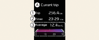 This display shows the accumulated trip distance (1), the total driving time (2), and the average fuel efficiency (3).