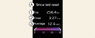 This display shows the trip distance (1), the total driving time (2), and the average fuel efficiency (3) information once per one ignition cycle.
