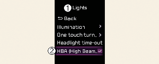 After selecting HBA (High Beam Assist) in the Settings menu, High Beam Assist will operate by following the procedure below.