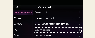 With the vehicle on, touch User settings → Driver assistance → Driving safety → Driving safety on the instrument cluster or Settings → Vehicle → Driver assistance → Driving safety on the infotainment system. You can select or deselect each function in this menu.