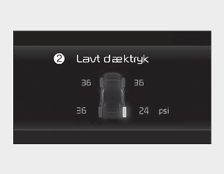 Som en ekstra sikkerhedsfunktion er bilen udstyret med et dæktryksovervågningssystem (TPMS), med en advarselslampe for lavt dæktryk, når et eller flere af dækkene ikke er pumpet tilstrækkeligt op. Derfor skal du stoppe og tjekke dækkene så hurtigt som muligt og pumpe dem op til det rette tryk, når advarselslampen for lavt dæktryk lyser. Kørsel på et meget underopustet dæk får dækket til at overophedes og kan føre til dækfejl. For lavt dæktryk øger desuden brændstofforbruget og forkorter dækkenes levetid, og kan påvirke bilens køreegenskaber og bremseevne.