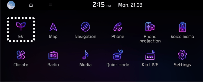 Αν επιλέξετε το μενού EV στην αρχική οθόνη του συστήματος πολυμέσων, μπορείτε να εισέλθετε στο μενού EV.