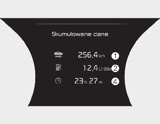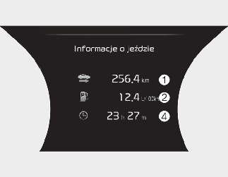 Na tym ekranie wyświetlono skumulowaną odległość podróży (1), średnie zużycie paliwa (2), chwilowe zużycie paliwa (3) i całkowity czas jazdy (4) po ponownym zatankowaniu.