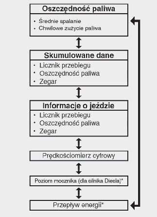 Zakres wskazań zużycia paliwa: od 0,0 do 30 km/l, l/100 km lub od 0,0 do 50,0 MPG