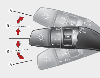 Aby włączyć kierunkowskazy, zapłon musi zostać włączony przyciskiem ENGINE START/STOP (włączenie/wyłączenie silnika). Aby włączyć kierunkowskaz, przestawić dźwigienkę w górę lub w dół (A).