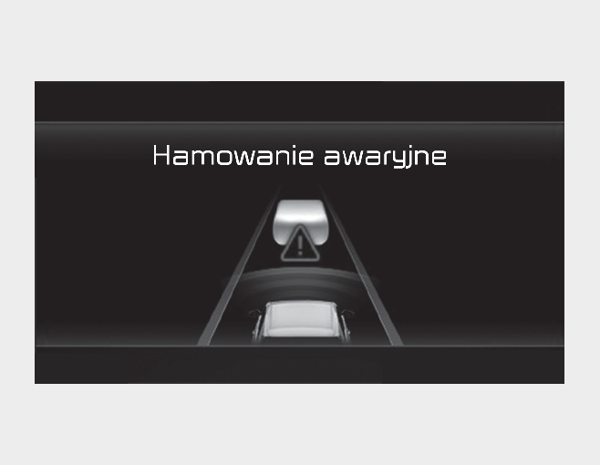 Aby ostrzec kierowcę o wspomaganiu hamowania awaryjnego, w zestawie wskaźników pojawia się komunikat ostrzegawczy „Emergency Braking” (Hamowanie awaryjne), rozlega się ostrzegawczy sygnał dźwiękowy i zostaje uruchomiona wibracja kierownicy.
