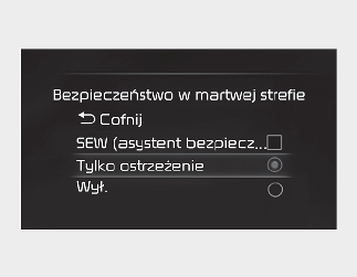 Po włączeniu zapłonu przełącznikiem zapłonu lub przyciskiem ENGINE START/STOP (włączenie/wyłączenie silnika) zaznaczyć opcję „User Settings (Ustawienia użytkownika) → Driver Assistance (Wspomaganie kierowcy) → Blind-Spot Safety (Monitorowanie martwego pola)” na wyświetlaczu LCD lub w systemie multimedialnym, aby wybrać funkcje, które mają działać.