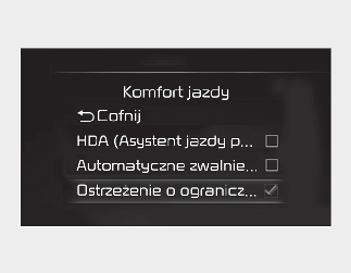 Po wybraniu opcji „Ostrzeżenie o ograniczeniu prędkości”, inteligentny asystent ograniczenia prędkości będzie informować kierowcę o ograniczeniu prędkości. Ponadto funkcja ostrzega kierowcę, gdy pojazd porusza się z prędkością większą niż dopuszczalna.