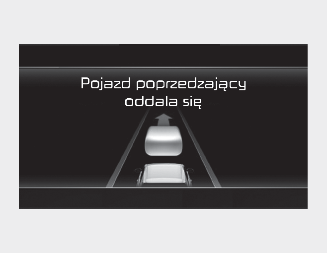 Gdy pojazd poprzedzający rusza, funkcja powiadomienia o ruszeniu pojazdu poprzedzającego informuje o tym kierowcę, wyświetlając w zestawie wskaźników komunikat „Leading vehicle is driving away” (Pojazd poprzedzający rusza) i włączając sygnał dźwiękowy.