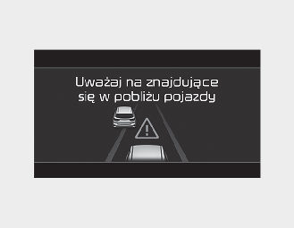 W poniższej sytuacji w zestawie wskaźników zostanie wyświetlony komunikat ostrzegawczy „Watch for surrounding vehicles” (Uważaj na inne pojazdy) i rozlegnie się sygnał dźwiękowy, aby ostrzec kierowcę o warunkach drogowych na trasie.