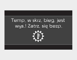 Jeśli to ostrzeżenie zostanie zignorowane, płynność jazdy może się pogorszyć. Może to spowodować nagłe zmiany biegów, regularne zmiany biegów lub szarpnięcia. Aby powrócić do normalnego trybu jazdy, należy zatrzymać pojazd i wcisnąć hamulec nożny lub zmienić pozycję skrzyni biegów na P (Postój).
