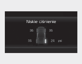 Zapalenie się wskaźników ostrzegawczych i pojawienie się na wyświetlaczu LCD zestawu wskaźników odpowiedniego komunikatu ostrzegawczego z systemu monitorowania ciśnienia w oponach oznacza, że w co najmniej jednej oponie wystąpił znaczny ubytek ciśnienia powietrza. Odpowiednia pozycyjna lampka wskaźnikowa niskiego ciśnienia powietrza w oponach będzie wskazywać konkretną oponę, w której doszło do spadku ciśnienia.