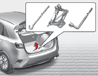 Podnośnik, dźwignia podnośnika i klucz do kół znajdują się w bagażniku.