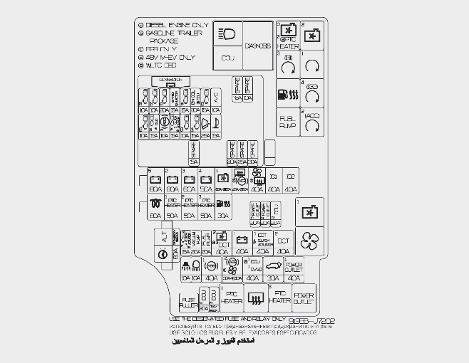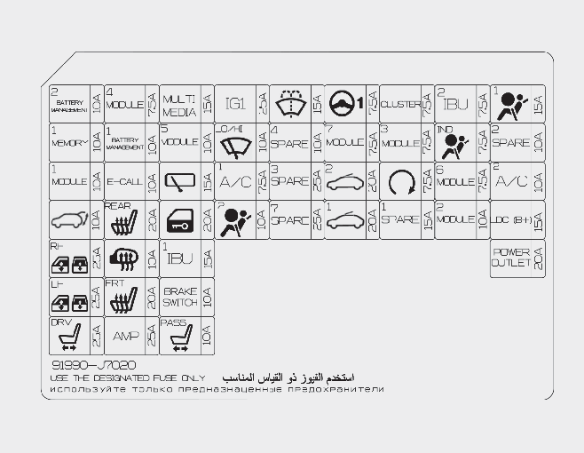 Moduł regulacji podgrzewacza tylnego siedzenia, moduł regulacji podgrzewacza przedniego siedzenia, moduł regulacji przedniego fotela z wentylacją, nagrzewnica dyszy, blok zaciskowy w komorze silnika (przekaźnik ŚWIATEŁ DROGOWYCH, przekaźnik DCU (jednostki sterowania wtryskiwaną dawką)), silnik elektryczny wentylatora |