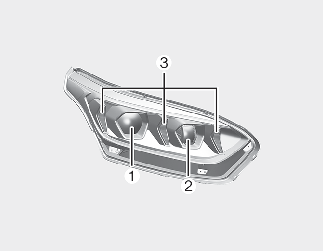 Jeśli światło mijania (1), przednie światło przeciwmgłowe (2), światło do jazdy dziennej/światło pozycyjne/przedni kierunkowskaz (3) nie świeci się, pojazd należy sprawdzić w profesjonalnym warsztacie.