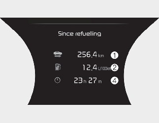 This display shows the accumulated trip distance (1), the average fuel efficiency (2), and the instant fuel economy (3), and the total driving time (4) after refuelling.