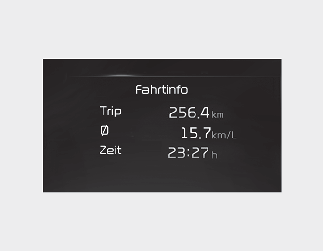 Diese Anzeige zeigt die kumulierte Fahrstrecke, die durchschnittliche Kraftstoffeffizienz sowie die Gesamtfahrzeit an.