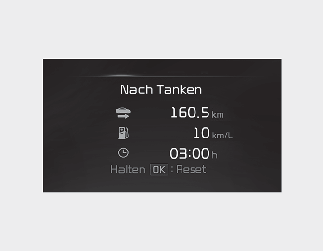 Wenn Sie die Taste „OK“ länger als 1 Sekunde lang drücken, nachdem die Informationen seit dem letzten Auftanken angezeigt werden, werden die Informationen zurückgesetzt.