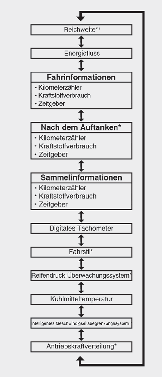 Diese Anzeige zeigt die Fahrstrecke, die durchschnittliche Kraftstoffeffizienz sowie die aktuelle Kraftstoffeffizienz (oder die Gesamtfahrzeit) seit dem letzten Auftanken an.