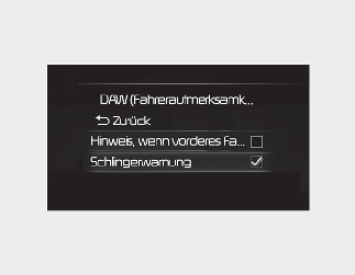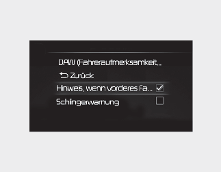 Wählen Sie, wenn der ENGINE START/STOP-Knopf in Position ON steht, im Einstellungsmenü die Option „Fahrerassistenz → Fahreraufmerksamkeits-Warnung“ aus oder deaktivieren Sie diese, um festzulegen, welche Funktionen verwendet werden sollen.