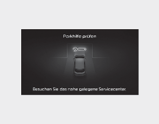 Wenn die ferngesteuerte intelligente Einparkhilfe nicht richtig funktioniert, erscheint die Warnmeldung „Check Parking Assist“ (Einparkhilfe überprüfen) auf dem Bildschirm des Infotainmentsystems. Wenn die Meldung erscheint, stoppen Sie die Funktion; wir empfehlen, die Funktion von einem Kia-Vertragshändler/Servicepartner prüfen zu lassen.