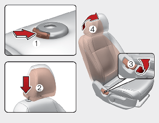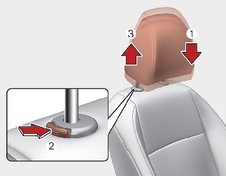 To lower the headrest, push and hold the release button (2) on the headrest support.