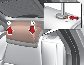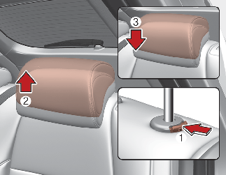 • To lower the headrest, push and hold the release button (2) on the headrest support and lower the headrest to the desired position (3).