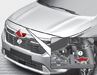 Go to the front of the vehicle, raise the bonnet slightly, push the secondary bonnet release lever (1) up side and lift the bonnet (2).