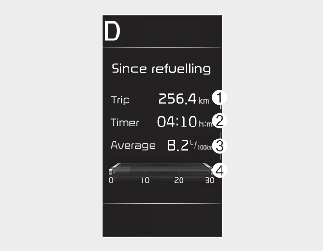 This display shows the trip distance (1), the total driving time (2), the average fuel efficiency (3), and the instant fuel economy (4, if equipped) information once per one ignition cycle.