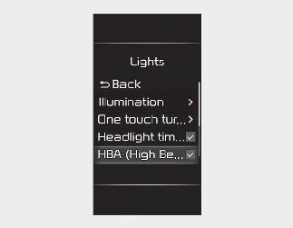With the ignition switch or ENGINE START/STOP button in the ON position, select 'User settings → Lights → HBA (High Beam Assist)' on the LCD display or 'Settings → Vehicle → Lights → HBA (High Beam Assist)' on the infotainment system.