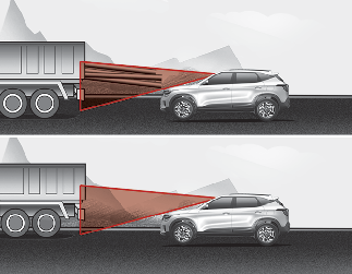 If the vehicle in front of you has cargo that extends rearward from the cab, or when the vehicle in front of you has higher ground clearance, additional special attention is required. Forward Collision-Avoidance Assist may not be able to detect the cargo extending from the vehicle. In these instances, you must maintain a safe braking distance from the rearmost object, and if necessary, steer your vehicle and depress the brake pedal to reduce your driving speed in order to maintain distance.