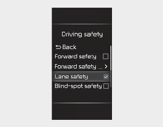 With the ignition switch or ENGINE START/STOP button in the ON position, select ‘User settings → Driver assistance → Driving safety’ on the LCD display or ‘Settings → Vehicle→ Driver assistance → Driving safety’ on the Infotainment system screen to set whether to use each function.