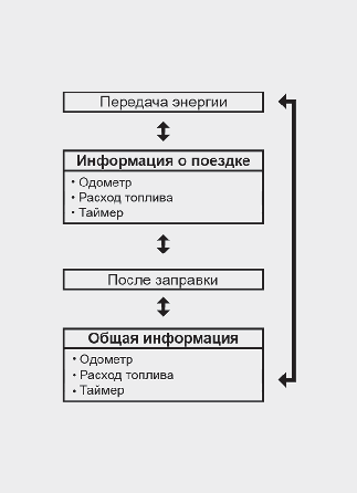 На дисплее отображается пройденное расстояние, средняя и моментальная эффективность использования топлива (или общее время в пути) после заправки.