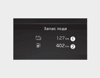 Запас хода — это расчетное расстояние, которое автомобиль может проехать на оставшемся заряде высоковольтной (гибридной) батареи (1, электропитание) и оставшемся топливе в баке (2, бензин).
