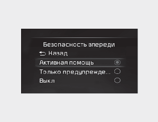 Если выбран пункт «Warning Only» (Только предупреждение), функция предупредит водителя с помощью сообщения, звукового сигнала или вибрации рулевого колеса в зависимости от уровня риска столкновения. Управление торможением не применяется.