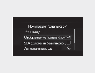 Когда кнопка запуска/остановки двигателя находится в положении «Вкл.», выберите в меню «Настройки» пункт «Помощь водителю» → «Blind-Spot Safety» (Мониторинг слепых зон) → «Blind Spot View» (Отображение «слепых зон»), чтобы включить монитор отображения «слепых зон», и отмените выбор для отключения системы.