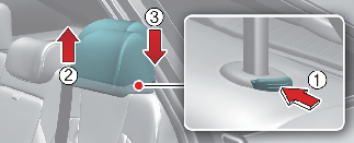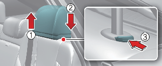 To raise the headrest, pull it up to the desired position (1). To lower the headrest, push and hold the release button (3) on the headrest support and lower the headrest to the desired position (2).