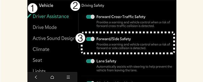 With the vehicle on, select Setup → Vehicle → Driver Assistance → Driving Safety → Forward/Side Safety on the infotainment system.