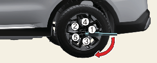 Position the wrench as shown in the drawing and tighten the wheel nuts. Be sure the socket is seated completely over the nut. Do not stand on the wrench handle or use an extension pipe over the wrench handle. Go around the wheel tightening every other nut until they are all tight. Double-check each nut for tightness. After changing wheels, have an authorized Kia dealer tighten the wheel nuts to their proper torque as soon as possible.
