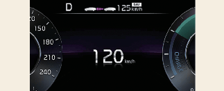 Je-li adaptivní tempomat, spolupracující s navigací, v činnosti, zobrazuje se na přístrojovém panelu následujícím způsobem:
