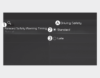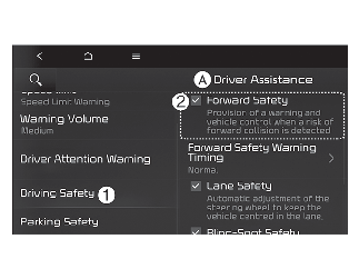 Sécurité avant : Une alerte sonore est émise en fonction du niveau de risque de collision, et le freinage est assisté. Si le menu suivant est désactivé, l’assistance à la prévention des collisions frontales sera désactivé et le témoin lumineux (