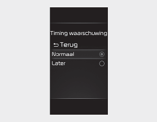 Selecteer voor het waarschuwingsmoment 'Late' ('Laat') wanneer er weinig verkeer is en u traag rijdt.