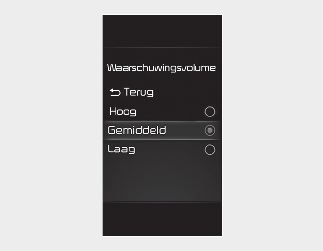 Terwijl het contactslot of de toets ENGINE START/STOP (Motor starten/stoppen) op AAN staat, selecteert u 'Bestuurdershulp → Waarschuwingsvolume in het menu Instellingen om het Waarschuwingsvolume voor Forward Collision-Avoidance Assist te wijzigen naar 'Hoog', 'Gemiddeld' of 'Laag'.