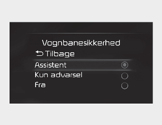 Hvis ‘Assist’ ('Assistent') er valgt, hjælper Vognbaneassistent automatisk føreren med at styre, når baneudgang registreres, for at hjælpe med at forhindre køretøjet i at bevæge sig ud af banen.
